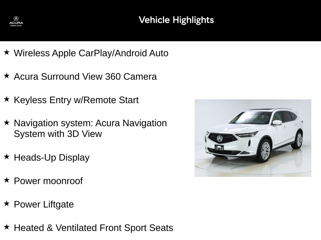 HARPER ACURA believes in the quality of the vehicles we sell so well that we provide an UNLIMITED MILES POWERTRAIN WARRANTY on every new and qualifying pre-owned vehicle it sells!!! This warranty is good at any ASE certified shop in the 48 continental United States!! Check out all these great options Heads-Up Display, Heated & Ventilated Front Sport Seats, Heated rear seats, Heated steering wheel, Navigation system: Acura Navigation System with 3D View, Power Liftgate, Power moonroof, Wheels: 20" x 9" Aluminum Alloy, 16 Speakers, 3rd row seats: split-bench, 4-Wheel Disc Brakes, 4.17 Axle Ratio, A/V remote: CabinControl, ABS brakes, Adaptive suspension, Air Conditioning, Alloy wheels, AM/FM radio: SiriusXM, Anti-whiplash front head restraints, Apple CarPlay/Android Auto, Audio memory, Auto High-beam Headlights, Auto tilt-away steering wheel, Auto-dimming Rear-View mirror, Automatic temperature control, Brake assist, Bumpers: body-color, Compass, Delay-off headlights, Driver door bin, Driver vanity mirror, Dual front impact airbags, Dual front side impact airbags, Electronic Stability Control, Emergency communication system: AcuraLink, Four wheel independent suspension, Front anti-roll bar, Front Bucket Seats, Front Center Armrest, Front dual zone A/C, Front fog lights, Front reading lights, Fully automatic headlights, Garage door transmitter: HomeLink, Heated door mirrors, Heated front seats, HVAC memory, Illuminated entry, Knee airbag, Lane departure: Lane Keeping Assist System (LKAS) active, Leather steering wheel, Low tire pressure warning, Memory seat, Occupant sensing airbag, Outside temperature display, Overhead airbag, Overhead console, Panic alarm, Passenger door bin, Passenger vanity mirror, Perforated Premium Milano Leather Trimmed Seats, Power door mirrors, Power driver seat, Power passenger seat, Power steering, Power windows, Premium audio system: Acura/ELS Studio 3D, Radio data system, Radio: ELS Studio 3D Premium Audio System, Rain sensing wipers, Rear air conditioning, Rear anti-roll bar, Rear reading lights, Rear seat center armrest, Rear window defroster, Rear window wiper, Remote keyless entry, Security system, Speed control, Speed-sensing steering, Speed-Sensitive Wipers, Split folding rear seat, Spoiler, Steering wheel memory, Steering wheel mounted audio controls, Tachometer, Telescoping steering wheel, Tilt steering wheel, Traction control, Trip computer, Turn signal indicator mirrors, Variably intermittent wipers, and Ventilated front seats. New Price! Certified.