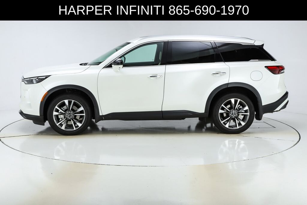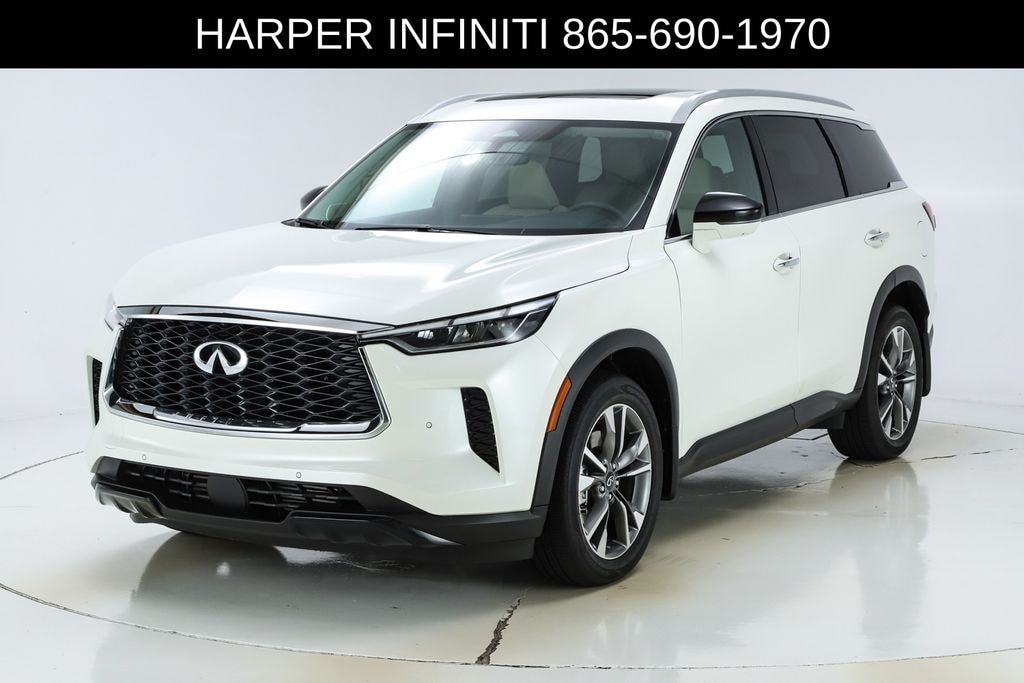 Harper INFINITI is proud to offer this wonderful-looking 2025 INFINITI QX60 in Majestic White HARPER INFINITI believes in the quality of the vehicles we sell so well that we provide an UNLIMITED MILES, POWERTRAIN WARRANTY on every new and qualifying pre-owned vehicle it sells!!! This warranty is good at any ASE certified shop in the 48 continental United States!! Check out all these great options 3rd row seats: bench, 4-Wheel Disc Brakes, ABS brakes, Air Conditioning, Alloy wheels, AM/FM radio: SiriusXM, Auto High-beam Headlights, Auto tilt-away steering wheel, Auto-dimming Rear-View mirror, Automatic temperature control, Brake assist, Delay-off headlights, Driver door bin, Driver vanity mirror, Dual front impact airbags, Dual front side impact airbags, Electronic Stability Control, Exterior Parking Camera Rear, Four wheel independent suspension, Front anti-roll bar, Front Bucket Seats, Front dual zone A/C, Front reading lights, Fully automatic headlights, Garage door transmitter: HomeLink, Heated door mirrors, Heated front seats, Heated rear seats, Heated steering wheel, Illuminated entry, Knee airbag, Leather Shift Knob, Leather steering wheel, Leather-Appointed Seating Surfaces, Low tire pressure warning, Memory seat, Navigation system: INFINITI InTouch Navigation, Occupant sensing airbag, Outside temperature display, Overhead airbag, Overhead console, Panic alarm, Passenger door bin, Passenger vanity mirror, Power door mirrors, Power driver seat, Power Liftgate, Power moonroof, Power passenger seat, Power steering, Power windows, Radio data system, Rain sensing wipers, Rear air conditioning, Rear anti-roll bar, Rear reading lights, Rear side impact airbag, Rear window defroster, Rear window wiper, Reclining 3rd row seat, Remote keyless entry, Security system, Speed control, Speed-sensing steering, Speed-Sensitive Wipers, Split folding rear seat, Spoiler, Steering wheel memory, Steering wheel mounted audio controls, Tachometer, Telescoping steering wheel, Tilt steering wheel, Traction control, Trip computer, Turn signal indicator mirrors, and Variably intermittent wipers.