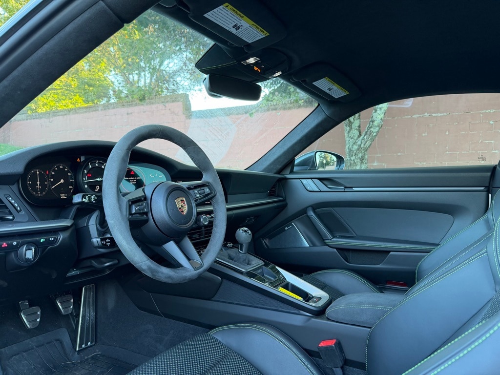 2024 Porsche 911 Carrera T RWD in GT Silver Metallic over Black Leather/Race-Tex interior with Lizard Green stitching. 3.0L H6 Turbocharged with 379hp mated to a 7-Speed Manual Transmission. For all options, please view the Porsche Build Sheet located within the vehicle's photos.