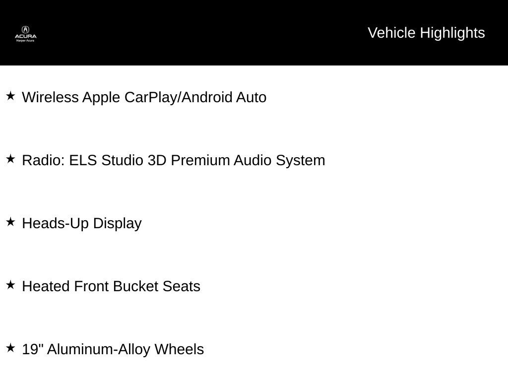 HARPER ACURA believes in the quality of the vehicles we sell so well that we provide an UNLIMITED MILES POWERTRAIN WARRANTY on every new and qualifying pre-owned vehicle it sells!!! This warranty is good at any ASE certified shop in the 48 continental United States!! Check out all these great options 19" Aluminum-Alloy Wheels, Heads-Up Display, Heated Front Bucket Seats, Radio: ELS Studio 3D Premium Audio System, 16 Speakers, 4-Wheel Disc Brakes, ABS brakes, Adaptive suspension, Air Conditioning, Alloy wheels, AM/FM radio: SiriusXM, Apple CarPlay/Android Auto, Auto High-beam Headlights, Auto-dimming Rear-View mirror, Automatic temperature control, Brake assist, Bumpers: body-color, Compass, Delay-off headlights, Driver door bin, Driver vanity mirror, Dual front impact airbags, Dual front side impact airbags, Electronic Stability Control, Emergency communication system: AcuraLink (subscription required), Four wheel independent suspension, Front anti-roll bar, Front Bucket Seats, Front Center Armrest, Front dual zone A/C, Front reading lights, Fully automatic headlights, Heated door mirrors, Heated front seats, Illuminated entry, Knee airbag, Lane departure: Lane Keeping Assist System (LKAS) active, Leather Shift Knob, Leather steering wheel, Low tire pressure warning, Occupant sensing airbag, Outside temperature display, Overhead airbag, Overhead console, Panic alarm, Passenger door bin, Passenger vanity mirror, Perforated Ultrasuede-Trimmed Front Seats, Power door mirrors, Power driver seat, Power steering, Power windows, Radio data system, Rain sensing wipers, Rear anti-roll bar, Rear side impact airbag, Rear window defroster, Remote keyless entry, Security system, Speed control, Speed-sensing steering, Speed-Sensitive Wipers, Split folding rear seat, Spoiler, Steering wheel mounted audio controls, Tachometer, Telescoping steering wheel, Tilt steering wheel, Traction control, Trip computer, Turn signal indicator mirrors, and Variably intermittent wipers.
