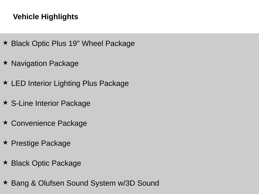 Check out all these great options Black Optic Package (Aluminum Ellipse Dark Inlays, Black Audi Rings & Model Badge, Black Exterior Trim & Mirror Housings, Black Side Sill Blades & Rear Lip Spoiler, Dark Chrome Exhaust Tips, Red Brake Calipers, and Wheels: 18" 5-Arm Trapezoid Design Titanium Finish), Black Optic Plus 19" Wheel Package (Wheels: 19" 5-Arm Rotor Design Bi-Color Finish), Convenience Package (Adaptive Cruise Control, Alarm System w/Motion Sensor, Audi Advanced Key, Audi Side Assist w/Pre Sense Rear, Auto-Dimming Exterior Mirrors w/Memory, Heated Steering Wheel, Memory for Driver's Seat, Parking System Plus, and SiriusXM w/360L), LED Interior Lighting Plus Package, Navigation Package (Audi Connect PLUS and MMI Navigation Plus), Prestige Package (2 Rear USB Charge Ports, Animation for Headlights & Taillights, Audi Active Lane Assist, Audi Phone Box, Audi Virtual Cockpit Plus, Bang & Olufsen Sound System w/3D Sound, Dual Pane Acoustic Glass for Front Side Windows, Hands-On Detection Steering Wheel, Head-Up Display, Heated Rear Seats, Leatherette Covered Center Console & Door Armrests, Matrix-Design LED Headlights w/Washers, Park Assist, Power Folding Exterior Mirrors, Top View Camera System, Traffic Jam Assist, and Traffic Sign Recognition), S-Line Interior Package (Brushed Aluminum Inlays, Leather/Dinamica Seating Surfaces, and Stainless Steel Pedal Caps), 10 Speakers, 4-Wheel Disc Brakes, ABS brakes, Air Conditioning, Alloy wheels, AM/FM radio, Anti-whiplash front head restraints, Audi Beam-Rings, Audi Guard All-Weather Mats, Audi Guard Wheel Lock Kit, Audi smartphone interface (Apple CarPlay/Android Auto), Auto High-beam Headlights, Auto-dimming Rear-View mirror, Automatic temperature control, Brake assist, Bumpers: body-color, Compass, Delay-off headlights, Driver door bin, Driver vanity mirror, Dual front impact airbags, Dual front side impact airbags, Electronic Stability Control, Emergency communication system: Audi connect CARE, Exterior Parking Camera Rear, Four wheel independent suspension, Front anti-roll bar, Front Bucket Seats, Front Center Armrest, Front dual zone A/C, Front fog lights, Front reading lights, Garage door transmitter: HomeLink, Genuine wood dashboard insert, Genuine wood door panel insert, Heated door mirrors, Heated front seats, Heated Front Sport Bucket Seats, Illuminated entry, Knee airbag, Leather Seating Surfaces, Leather Shift Knob, Leather steering wheel, Low tire pressure warning, Occupant sensing airbag, Outside temperature display, Overhead airbag, Overhead console, Panic alarm, Passenger door bin, Passenger vanity mirror, Power door mirrors, Power driver seat, Power moonroof, Power passenger seat, Power steering, Power windows, Radio data system, Radio: Audi Sound System, Rain sensing wipers, Rear air conditioning, Rear anti-roll bar, Rear reading lights, Rear seat center armrest, Rear window defroster, Remote keyless entry, Speed control, Speed-sensing steering, Speed-Sensitive Wipers, Split folding rear seat, Steering wheel mounted audio controls, Tachometer, Telescoping steering wheel, Tilt steering wheel, Traction control, Trip computer, Turn signal indicator mirrors, Variably intermittent wipers, and Wheels: 18" 5-Double-Spoke Design. Please contact Harper Audi at (865) 691-2834 for details. Come see why Harper has the easiest car buying experience in the South! Clean CARFAX. Chronos Gray Metallic quattro 7-Speed Automatic S tronic 2.0L TFSI 2023 Audi A4 45 S line Prestige in Chronos Gray Metallic, 2 Rear USB Charge Ports, Adaptive Cruise Control, Alarm System w/Motion Sensor, Aluminum Ellipse Dark Inlays, Animation for Headlights & Taillights, Audi Active Lane Assist, Audi Advanced Key, Audi Connect PLUS, Audi Phone Box, Audi Side Assist w/Pre Sense Rear, Audi Virtual Cockpit Plus, Auto-Dimming Exterior Mirrors w/Memory, Bang & Olufsen Sound System w/3D Sound, Black Audi Rings & Model Badge, Black Exterior Trim & Mirror Housings, Black Optic Package, Black Optic Plus 19" W