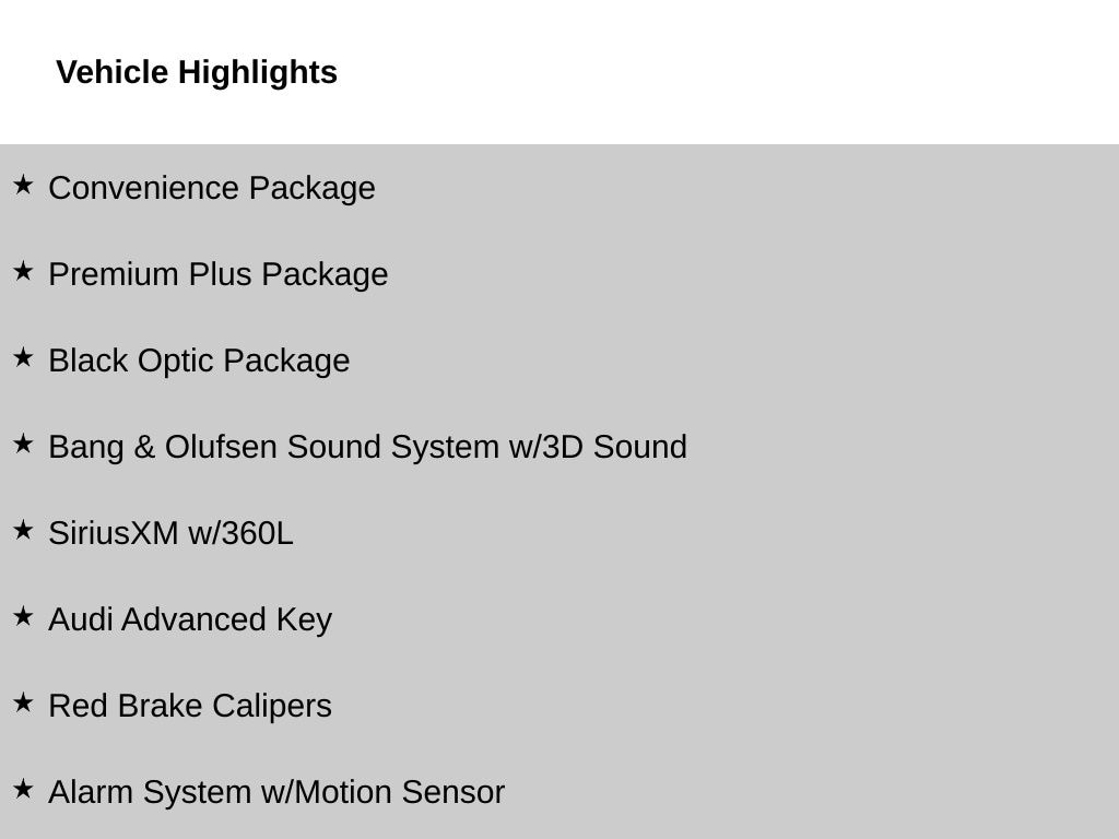 Check out all these great options Black Optic Package (Aluminum Ellipse Dark Inlays, Black Audi Rings & Model Badge, Black Exterior Trim & Mirror Housings, Black Side Sill Blades & Rear Lip Spoiler, Dark Chrome Exhaust Tips, Red Brake Calipers, and Wheels: 18" 5-Arm Trapezoid Design Titanium Finish), Convenience Package (Adaptive Cruise Control, Alarm System w/Motion Sensor, Audi Advanced Key, Audi Side Assist w/Pre Sense Rear, Auto-Dimming Exterior Mirrors w/Memory, Heated Steering Wheel, Memory for Driver's Seat, Parking System Plus, and SiriusXM w/360L), Premium Plus Package (2 Rear USB Charge Ports, Audi Active Lane Assist, Audi Phone Box, Audi Virtual Cockpit Plus, Bang & Olufsen Sound System w/3D Sound, Hands-On Detection Steering Wheel, Leatherette Covered Center Console & Door Armrests, Power Folding Exterior Mirrors, Top View Camera System, and Traffic Jam Assist), 10 Speakers, 4-Wheel Disc Brakes, ABS brakes, Air Conditioning, Alloy wheels, AM/FM radio, Anti-whiplash front head restraints, Audi Beam-Rings, Audi Guard All-Weather Mats, Audi smartphone interface (Apple CarPlay/Android Auto), Auto High-beam Headlights, Auto-dimming Rear-View mirror, Automatic temperature control, Brake assist, Bumpers: body-color, Compass, Delay-off headlights, Driver door bin, Driver vanity mirror, Dual front impact airbags, Dual front side impact airbags, Electronic Stability Control, Emergency communication system: Audi connect CARE, Exterior Parking Camera Rear, Four wheel independent suspension, Front anti-roll bar, Front Bucket Seats, Front Center Armrest, Front dual zone A/C, Front fog lights, Front reading lights, Garage door transmitter: HomeLink, Genuine wood dashboard insert, Genuine wood door panel insert, Heated door mirrors, Heated front seats, Heated Front Sport Bucket Seats, Illuminated entry, Integrated Toll Module Delete (DISC), Knee airbag, Leather Seating Surfaces, Leather Shift Knob, Leather steering wheel, Low tire pressure warning, Occupant sensing airbag, Outside temperature display, Overhead airbag, Overhead console, Panic alarm, Passenger door bin, Passenger vanity mirror, Power door mirrors, Power driver seat, Power moonroof, Power passenger seat, Power steering, Power windows, Radio data system, Radio: Audi Sound System, Rain sensing wipers, Rear air conditioning, Rear anti-roll bar, Rear reading lights, Rear seat center armrest, Rear window defroster, Remote keyless entry, Speed control, Speed-sensing steering, Speed-Sensitive Wipers, Split folding rear seat, Steering wheel mounted audio controls, Tachometer, Telescoping steering wheel, Tilt steering wheel, Traction control, Trip computer, Turn signal indicator mirrors, Variably intermittent wipers, and Wheels: 18" 5-Double-Spoke Design. Please contact Harper Audi at (865) 691-2834 for details. Come see why Harper has the easiest car buying experience in the South! CARFAX One-Owner. Clean CARFAX. Daytona Gray Pearl quattro 7-Speed Automatic S tronic 2.0L TFSI 2023 Audi A4 45 S line Premium Plus in Daytona Gray Pearl, 2 Rear USB Charge Ports, Adaptive Cruise Control, Alarm System w/Motion Sensor, Aluminum Ellipse Dark Inlays, Audi Active Lane Assist, Audi Advanced Key, Audi Phone Box, Audi Side Assist w/Pre Sense Rear, Audi Virtual Cockpit Plus, Auto-Dimming Exterior Mirrors w/Memory, Bang & Olufsen Sound System w/3D Sound, Black Audi Rings & Model Badge, Black Exterior Trim & Mirror Housings, Black Optic Package, Black Side Sill Blades & Rear Lip Spoiler, Convenience Package, Dark Chrome Exhaust Tips, Hands-On Detection Steering Wheel, Heated Steering Wheel, Leatherette Covered Center Console & Door Armrests, Memory for Driver's Seat, Parking System Plus, Power Folding Exterior Mirrors, Premium Plus Package, Red Brake Calipers, SiriusXM w/360L, Top View Camera System, Traffic Jam Assist, Wheels: 18" 5-Arm Trapezoid Design Titanium Finish.