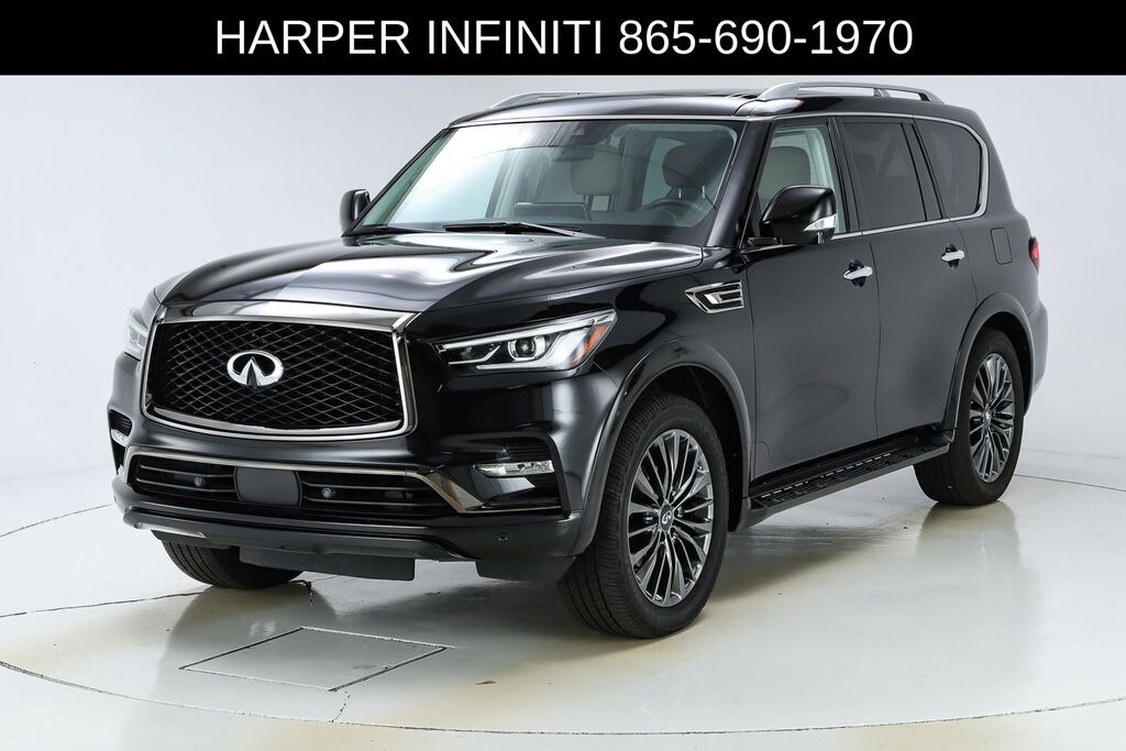 Harper INFINITI is pumped up to offer this superb-looking 2022 INFINITI QX80 in Mineral Black HARPER INFINITI believes in the quality of the vehicles we sell so well that we provide an UNLIMITED MILES, POWERTRAIN WARRANTY on every new and qualifying pre-owned vehicle it sells!!! This warranty is good at any ASE certified shop in the 48 continental United States!! Check out all these great options Cargo Package (Console Net, First-Aid Kit, High-Density Non-Slip Rear Cargo Carpet, and Nylon-Cord Cargo Net), 13 Speakers, 2.937 Axle Ratio, 3rd row seats: split-bench, 4-Wheel Disc Brakes, ABS brakes, Air Conditioning, Alloy wheels, AM/FM radio: SiriusXM, Anti-whiplash front head restraints, Auto High-beam Headlights, Auto tilt-away steering wheel, Auto-dimming door mirrors, Auto-dimming Rear-View mirror, Auto-leveling suspension, Automatic temperature control, Brake assist, Bumpers: body-color, Compass, Delay-off headlights, Driver door bin, Driver vanity mirror, Dual front impact airbags, Dual front side impact airbags, Electronic Stability Control, Emergency communication system: INFINITI InTouch w/1-year trial, Four wheel independent suspension, Front anti-roll bar, Front Bucket Seats, Front Center Armrest, Front dual zone A/C, Front fog lights, Front reading lights, Fully automatic headlights, Garage door transmitter: HomeLink, Heated door mirrors, Heated Front Bucket Seats, Heated front seats, Heated steering wheel, Illuminated entry, INFINITI Radiant Illuminated Kick Plates, Leather Shift Knob, Leather steering wheel, Leather-Appointed Seats, Literature Kit, Low tire pressure warning, Memory seat, Navigation system: INFINITI InTouch Navigation, Occupant sensing airbag, Outside temperature display, Overhead airbag, Overhead console, Panic alarm, Passenger door bin, Passenger vanity mirror, Power door mirrors, Power driver seat, Power Liftgate, Power moonroof, Power passenger seat, Power steering, Power windows, Premium audio system: Bose, Premium Select Sahara Stone Interior, Radio data system, Radio: Bose Premium Audio System w/13 Speakers, Rain sensing wipers, Rear air conditioning, Rear anti-roll bar, Rear reading lights, Rear seat center armrest, Rear window defroster, Rear window wiper, Reclining 3rd row seat, Remote keyless entry, Security system, Speed control, Speed-sensing steering, Split folding rear seat, Spoiler, Steering wheel memory, Steering wheel mounted audio controls, Tachometer, Telescoping steering wheel, Tilt steering wheel, Traction control, Trip computer, Turn signal indicator mirrors, Variably intermittent wipers, Voltmeter, and Wheels: 22" x 8.0" Dark Cast Chrome Aluminum-Alloy.