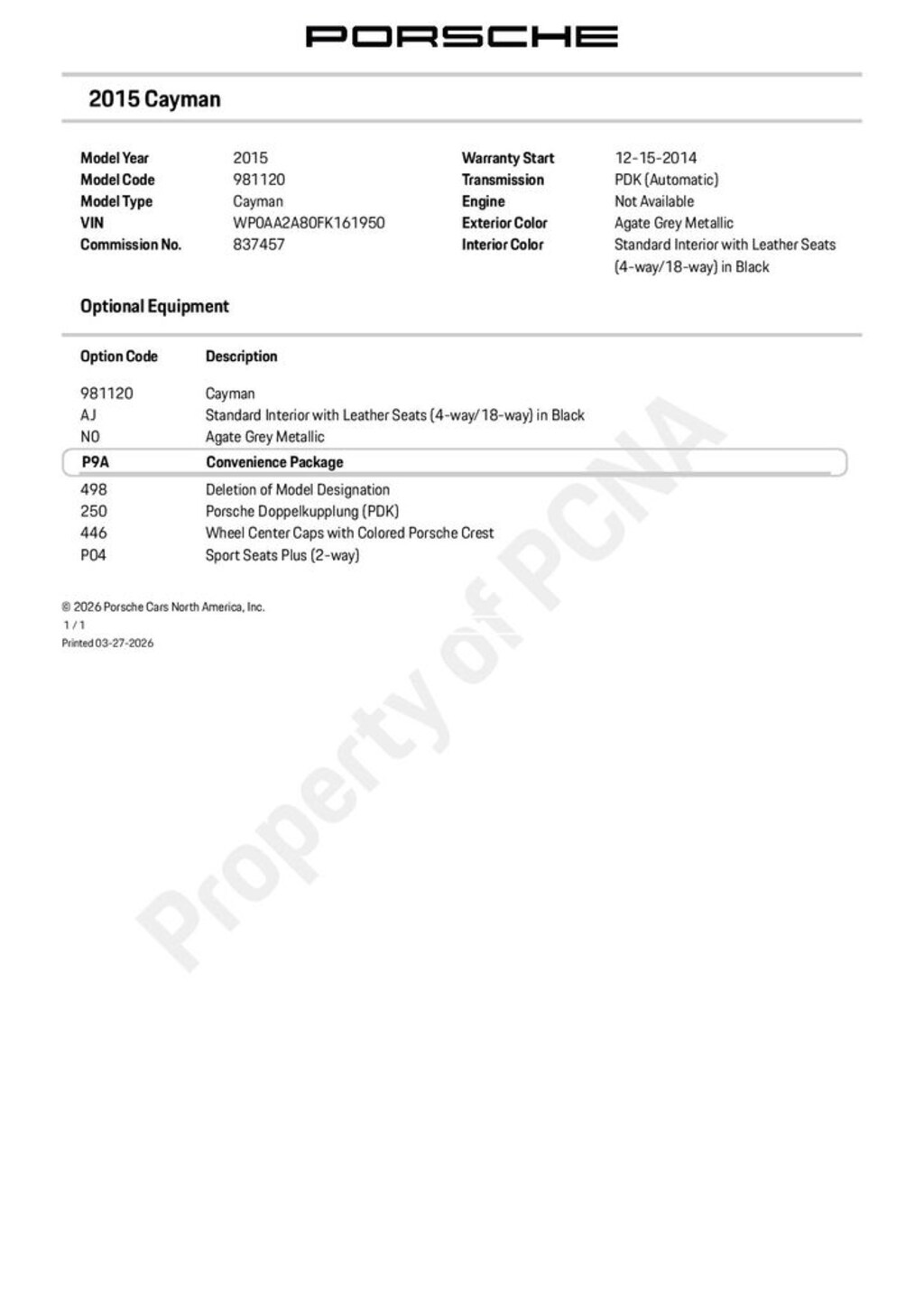 2015 Porsche Cayman in Agate Gray Metallic over Black leather interior. 2.7L H6 mated to a 7-Speed Porsche Doppelkupplung (PDK) Transmission. For all features and options, please view the Window Sticker located within the vehicle's photos.