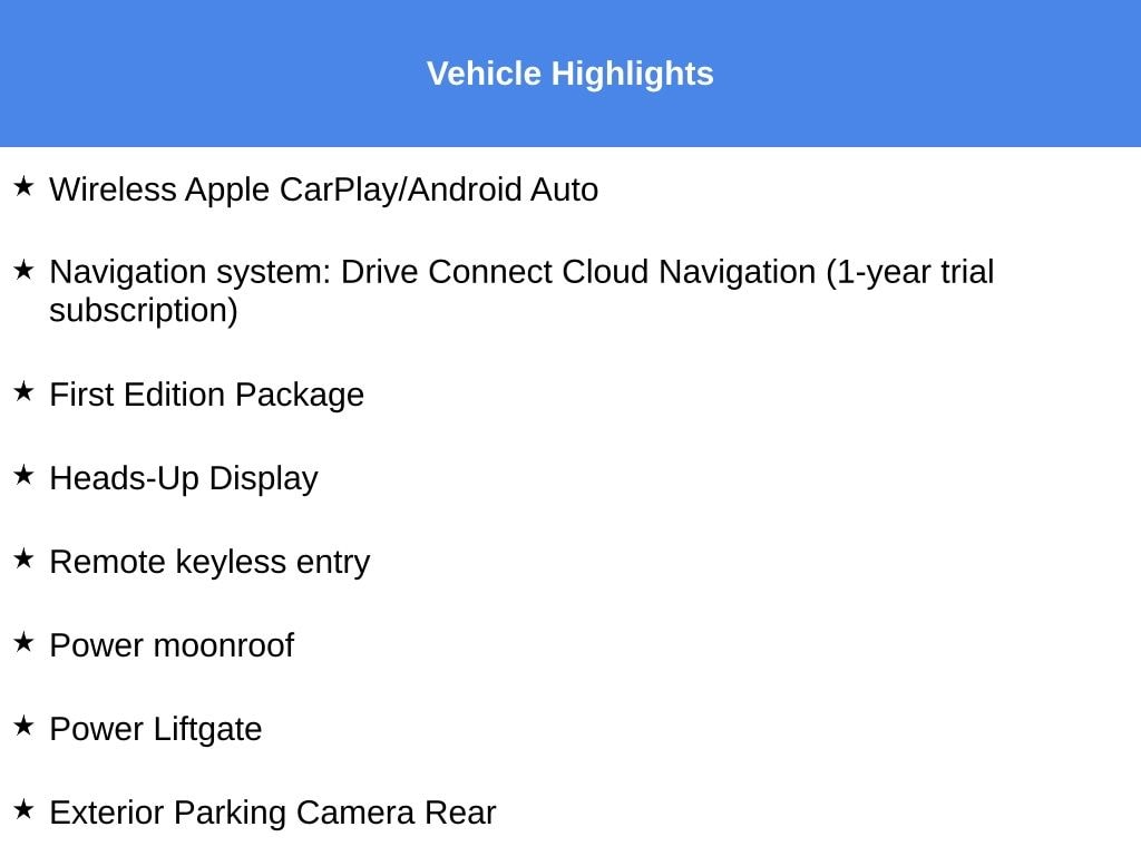 HARPER ACURA believes in the quality of the vehicles we sell so well that we provide an UNLIMITED MILES POWERTRAIN WARRANTY on every new and qualifying pre-owned vehicle it sells!!! This warranty is good at any ASE certified shop in the 48 continental United States!! Check out all these great options First Edition Package, 18" x 7.5J Alloy Wheels, Exterior Parking Camera Rear, Heads-Up Display, Heated & Ventilated Front Seats, Heated steering wheel, Navigation system: Drive Connect Cloud Navigation (1-year trial subscription), Power Liftgate, Power moonroof, Remote keyless entry, 14 Speakers, 4-Wheel Disc Brakes, ABS brakes, Air Conditioning, Alloy wheels, AM/FM radio: SiriusXM, Apple CarPlay/Android Auto, Auto High-beam Headlights, Auto tilt-away steering wheel, Auto-dimming Rear-View mirror, Automatic temperature control, Brake assist, Compass, Delay-off headlights, Driver door bin, Driver vanity mirror, Dual front impact airbags, Dual front side impact airbags, Electronic Stability Control, Emergency communication system: Safety Connect (up to 10-year trial subscription), Front anti-roll bar, Front Bucket Seats, Front Center Armrest, Front dual zone A/C, Front fog lights, Front reading lights, Front wheel independent suspension, Fully automatic headlights, Garage door transmitter: HomeLink, Heated door mirrors, Heated front seats, Illuminated entry, Knee airbag, Leather Seat Trim, Leather Shift Knob, Leather steering wheel, Low tire pressure warning, Memory seat, Occupant sensing airbag, Outside temperature display, Overhead airbag, Overhead console, Panic alarm, Passenger door bin, Passenger vanity mirror, Power door mirrors, Power driver seat, Power steering, Power windows, Radio data system, Radio: Toyota Audio Multimedia System, Rain sensing wipers, Rear air conditioning, Rear anti-roll bar, Rear reading lights, Rear seat center armrest, Rear window defroster, Rear window wiper, Roof rack, Security system, Speed control, Speed-sensing steering, Split folding rear seat, Spoiler, Steering wheel memory, Steering wheel mounted audio controls, Telescoping steering wheel, Tilt steering wheel, Traction control, Trip computer, Turn signal indicator mirrors, Variably intermittent wipers, and Ventilated front seats. New Price!