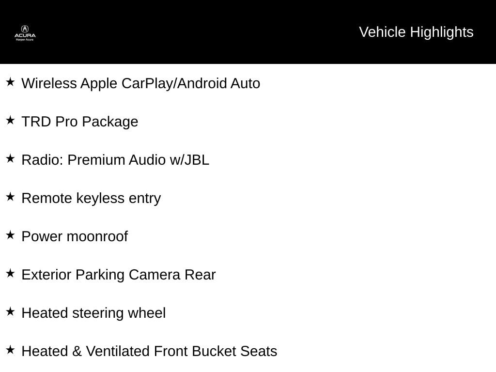HARPER ACURA believes in the quality of the vehicles we sell so well that we provide an UNLIMITED MILES POWERTRAIN WARRANTY on every new and qualifying pre-owned vehicle it sells!!! This warranty is good at any ASE certified shop in the 48 continental United States!! Check out all these great options TRD Pro Package, Exterior Parking Camera Rear, Heated & Ventilated Front Bucket Seats, Heated steering wheel, Power moonroof, Radio: Premium Audio w/JBL, Remote keyless entry, Wheels: 18" x 8" Black BBS Forged Aluminum, 12 Speakers, 3.31 Axle Ratio, 4-Wheel Disc Brakes, ABS brakes, Air Conditioning, Alloy wheels, AM/FM radio: SiriusXM, Apple CarPlay/Android Auto, Auto High-beam Headlights, Auto-dimming door mirrors, Auto-dimming Rear-View mirror, Automatic temperature control, Brake assist, Bumpers: body-color, Delay-off headlights, Driver door bin, Driver vanity mirror, Dual front impact airbags, Dual front side impact airbags, Electronic Stability Control, Emergency communication system: Safety Connect (10-year trial), Front anti-roll bar, Front Bucket Seats, Front Center Armrest, Front dual zone A/C, Front fog lights, Front reading lights, Front wheel independent suspension, Fully automatic headlights, Garage door transmitter: HomeLink, Heated door mirrors, Heated front seats, Illuminated entry, Knee airbag, Leather Shift Knob, Low tire pressure warning, Memory seat, Navigation System, Occupant sensing airbag, Outside temperature display, Overhead airbag, Overhead console, Panic alarm, Passenger door bin, Passenger vanity mirror, Power door mirrors, Power driver seat, Power passenger seat, Power steering, Power windows, Radio data system, Rear reading lights, Rear seat center armrest, Rear step bumper, Rear window defroster, Security system, SofTex Seat Trim, Speed control, Speed-sensing steering, Split folding rear seat, Sport steering wheel, Steering wheel mounted audio controls, Tachometer, Telescoping steering wheel, Tilt steering wheel, Traction control, Trip computer, Turn signal indicator mirrors, Variably intermittent wipers, Ventilated front seats, and Voltmeter. New Price!